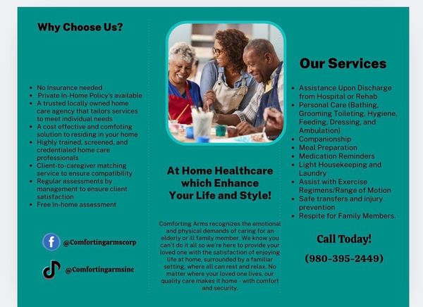 Comforting Arms Corp. Mission is to deliver home care and enhanced outpatient therapy services that's flexible and tailored to each individuals unique situation. Giving them the confidence to continue an active and healthy lifestyle at home. With Focusing on improving the overall health, well-being, and quality of life for our individuals. Support to both, the individual and their family members. Specializing in providing high-quality, personalized care that supports and maintains everyone's independence and well-being in their own homes.